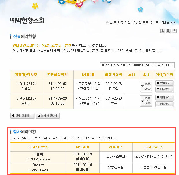 ※ 기존 예약조회현황 아래에 검사예약현황이 제공되고 있습니다.